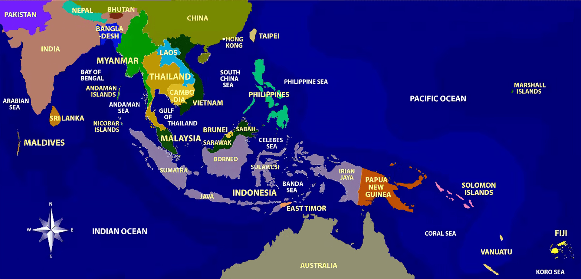 East and Southeast Asia: Australia, Brunei, Cambodia, China, Indonesia, Japan, Malaysia, Myanmar (Burma), New Zealand, North Korea, Philippines, Singapore, South Korea, Taiwan, Thailand, Vietnam, and the Pacific Island nations.